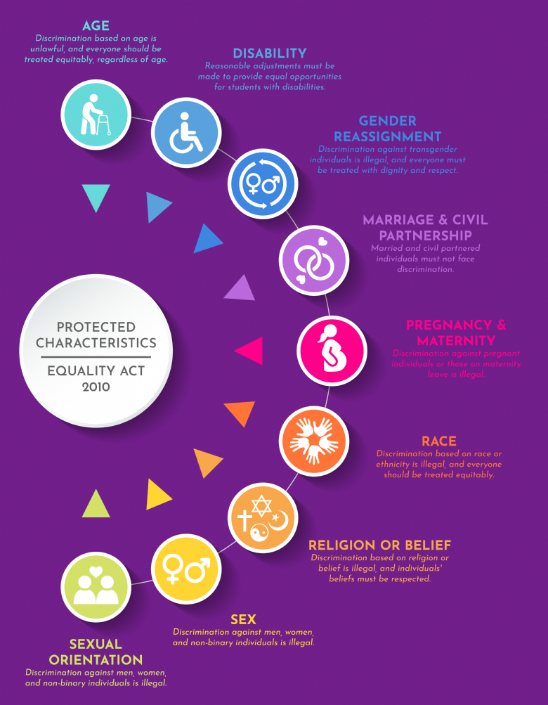 Under the Equality Act 2010, protected characteristics are specific attributes or traits that form part of a person's identity that are legally safeguarded against unlawful discrimination (treating someone 'less favourably' than someone else). The nine protected characteristics are: